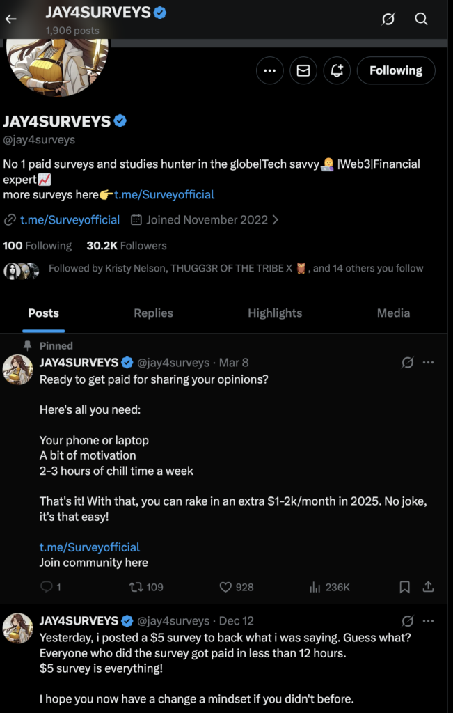 This Telegram-based community connects people to paid surveys, focus groups, and one-on-one interviews, with users reportedly earning between $10 and $500 per session.